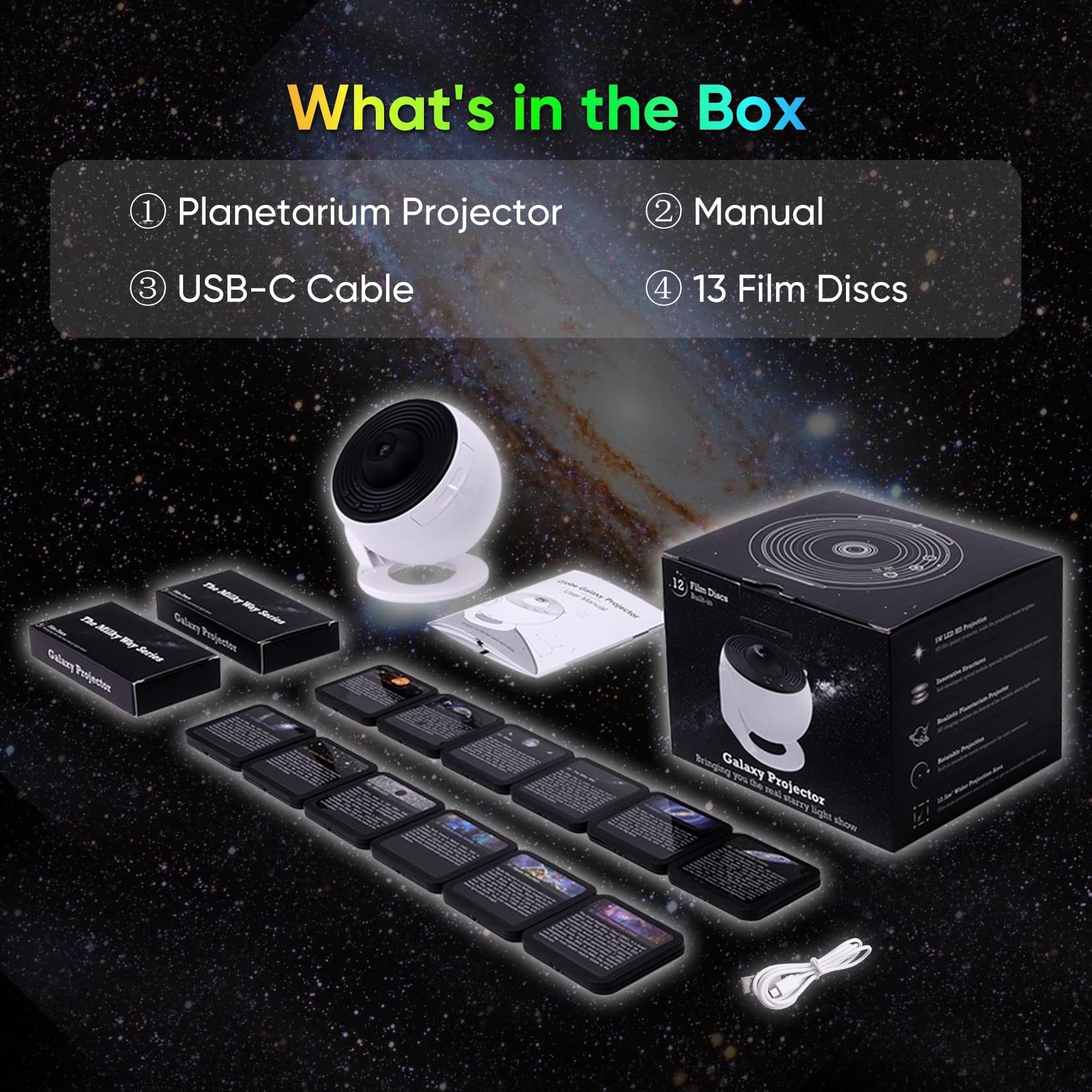✔ 12 DIFFERENT EFFECTS: With a selection of 12 high-definition film discs featuring captivating effects such as the Solar System, Earth, Moon and various galaxies including Andromeda, this space projector delivers vibrant projections of celestial bodies and nebulae, immersing viewers in a mesmerizing world of cosmic wonders.